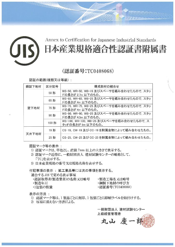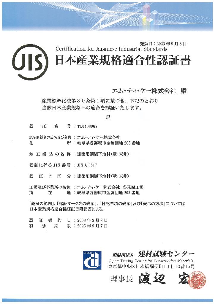 MTK各務原工場は建築用鋼製下地材(壁・天井)について2008年9月8日に日本工業規格(JIS)適合性認証を取得しております。